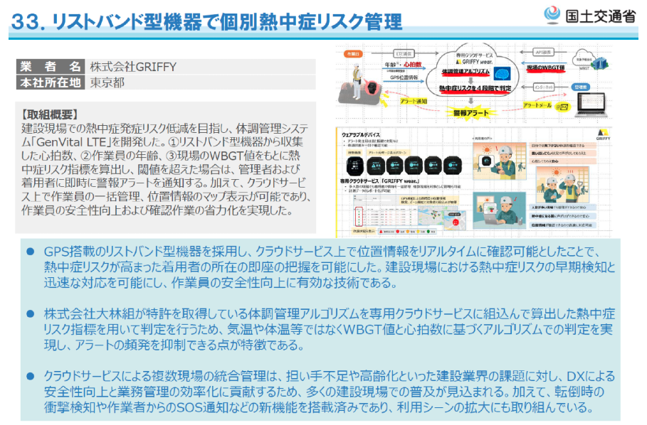 • GPS搭載のリストバンド型機器を採用し、クラウドサービス上で位置情報をリアルタイムに確認可能としたことで、熱中症リスクが高まった着用者の所在の即座の把握を可能にした。建設現場における熱中症リスクの早期検知と迅速な対応を可能にし、作業員の安全性向上に有効な技術である。