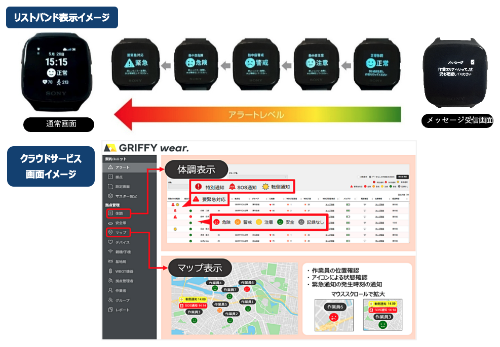 • 株式会社大林組と共同開発を行い、2024年に大林組が施工する約60現場、約3,000人の作業員に導入された「GenVital」と同様、大林組が開発した体調管理判定アルゴリズムを使用します。心拍数を計測するリストバンドから、専用クラウドサービス「GRIFFY wear.」にLTE通信で直接データを送信するため、現場作業員はリストバンドを装着するだけで手軽に利用可能です。